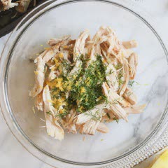 Thịt ức gà luộc chín, xé nhỏ. Thì là rửa sạch, băm nhỏ. trộn gà xé với thì là, bào vỏ chanh trực tiếp vào gà xé, sau đó vắt nước cốt chanh vào. Rưới dầu olive cùng muối vào hỗn hợp, trộn đều là xong.