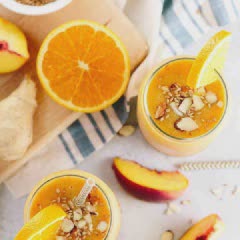 Sinh tố cam đào gừng dưới đây là một món không những ngon miệng mà còn có "trách nhiệm" cao cả là làm đẹp cho các chị em, giúp chị em có một làn da mượt mà, vóc dáng thanh mảnh và bye bye "vòng eo bánh mì". Cảm giác đá xay tan trong miệng, xen lẫn với vị chua chua, ngọt mát của cam, đào và vị cay the của gừng sẽ đem lại cho bạn một món nước uống giải khát mới lạ và mát lạnh.