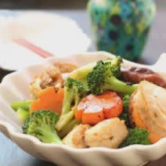 Phi thơm tỏi băm với 2 muỗng canh dầu ăn thì cho cà rốt vào xào. Khi cà rốt mềm, thì cho sò điệp vào xào cho đến khi sò điệp chín thì cho nấm đông cô vào, sau cùng cho bông cải xanh. Xào thêm 3-5 phút, thì nêm 1 muỗng cà phê hạt nêm, 1 muỗng cà phê bột ngọt, đảo đều cho thấm gia vị rồi tắt bếp.