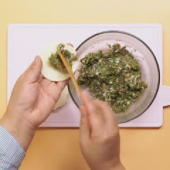 Cho rau thì là đã cắt khúc vào thau thịt. Trộn đến khi các thành phần đều nhau thì bắt đầu cho vào vỏ sủi cảo để gói. Múc 1 lượng thịt vừa phải, cho vào vỏ sủi cảo, gập sủi cảo lại, ấn chặt 2 mép để khi nấu, nước không vào phần thịt. Làm lần lượt đến khi hết thịt và bánh sủi cảo.