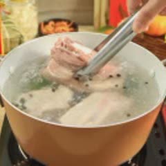 Luộc thịt: Cho vào nồi nước 3gr muối, 2gr tiêu hột, 20ml rượu trắng và 30gr hành lá. Tiếp theo cho thịt vào luộc chín 30 phút. Sau đó vớt thịt ra ngâm vào thau nước đá lạnh 15 phút để thịt săn chắc lại.