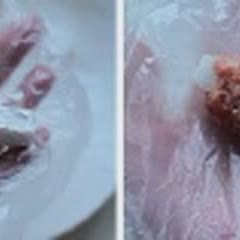 Đổ bột ra đĩa sâu lòng hoặc bát tô. Cho củ cải trắng vào lăn qua áo đều một lớp bột. Đeo găng tay thực phẩm, múc một muỗng thịt băm vào lòng bàn tay, tán mỏng. Đặt củ cải vào giữa, bọc lấy củ cải, chừa lại phần hai đầu củ cải chứ không viên kín.