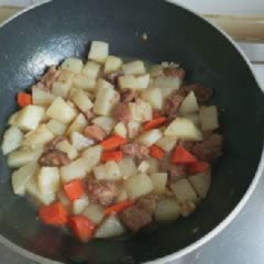 Rưới vào 1 muỗng canh nước tương, 2 muỗng canh nước, xào cho khoai tây và cà rốt sắp chín thì cho thịt bò đã ướp vào đảo đều cho thịt bò săn lại.
