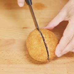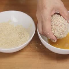Đánh đều quả trứng sống với nước và 1.5g tiêu. Cho thịt bọc trứng ra khỏi tủ lạnh, lăn đều vào chén bột chiên xù rồi thả vào chén trứng. Tiếp tục cho viên thịt bọc trứng vào chén bột chiên xù lăn một lượt nữa rồi để ra khay. Làm tương tự với viên thịt còn lại.