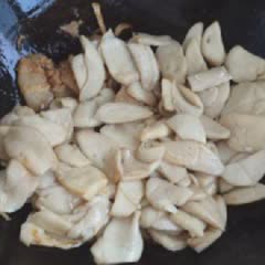 Đun nóng 1 muỗng canh dầu ăn, cho ớt xanh vào xào cho ớt dịu đi cho ra để riêng. Làm tương tự với nấm đùi gà.
