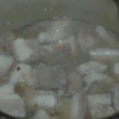 Đổ nước ngập mặt thịt, dùng cả phần nước ngâm nấm gạn bỏ cặn cho vào cùng, đun sôi rồi hớt bọt, hầm trong khoảng 30-40 phút đến khi thịt chín mềm. Trong quá trình hầm nếu vẫn có bọt thì cứ tiếp tục hớt đến khi hết bọt thì thôi.