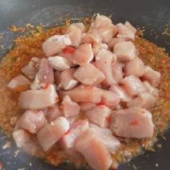 Thịt heo rửa sạch, cắt miếng vuông nhỏ vừa ăn. Ướp thịt với chút nước mắm cho đậm đà. Sả, hành tím, tỏi, ớt và riềng cho vào máy xay nhuyễn hoặc có thể băm nhỏ. Hành lá xắt nhỏ.