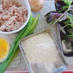 Lá tía tô nhặt rửa sạch, để ráo. Áo bột xung quanh lá tía tô. Hành lá rửa sạch, thái nhỏ. Thịt heo xay cho vào tô cùng 1 củ hành tím nhỏ băm nhỏ, 2 tép tỏi băm, 1 muỗng cà phê dầu hào,1/3 muỗng cà phê bột nêm, 1/3 muỗng cà phê đường, 1/2 muỗng cà phê nước mắm, 1.3 muỗng cà phê tiêu.