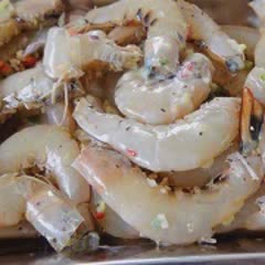 Tôm cắt bỏ bớt rau và chân tôm, rửa sạch, để ráo nước. Trong tô nhỏ trộn đều 1 muỗng canh rượu nấu ăn, 2 muỗng canh nước mắm, 1 muỗng canh dầu hào, 2 muỗng canh nước cốt chanh, 1.5 muỗng canh đường, 1 muỗng canh nước hòa chung trong một bát.