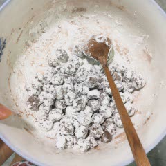 Khi cục bột nguội, dùng tay nhồi đến khi cục bột dẻo, mịn. Lấy ít bột vo thành từng viên nhỏ như những hạt trân châu thường thấy. Rồi lấy ít bột áo lên để chúng không dính lại với nhau.