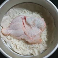 Sau đó cho gạo vào xửng hấp, tạo một lỗ ở giữa (làm như vậy để xôi hấp được nhanh chín hơn). Tiếp đó đặt thịt gà lên trên và đậy nắp, đem hấp đến khi thịt chín thì lấy ra để nguội. Còn xôi dùng đũa xới cho tơi ra.