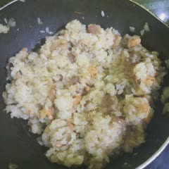 Làm nóng chảo với một ít dầu. Bỏ tôm khô vào xào cho thơm, sau đó thêm hành tây vào xào đến khi hành chuyển trong thì cho lạp xưởng và nấm đông cô vào xào ở lửa lớn đến khi lạp xưởng có màu sẫm, hơi xém cạnh. Sau đó cho xôi vào.